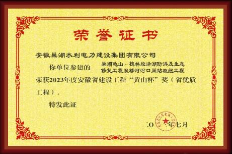 巢湖龜山~槐林段沿湖防洪及生態修復工程雙橋河河口閘站樞紐工程榮獲“黃山杯”獎( 省優質工程 )