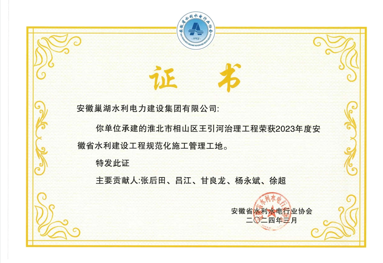淮北市相山區王引河治理工程榮獲2023年度安徽省水利建設工程規范化施工管理工地